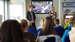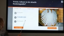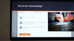 Herr Henrichmann zeigt uns seinen Platz im deutschen Bundestag. Er gehört zur CDU/CSU-Fraktion.