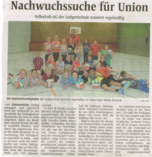 In den 4. Klassen wird gemeinsam mit Union Lüdinghausen im Sportunterricht eine Volleyballeinheit durchgeführt. Die Kinder erhalten einen ersten Einblick in die Sportart und erlernen spielerisch das Pritschen und Baggern.